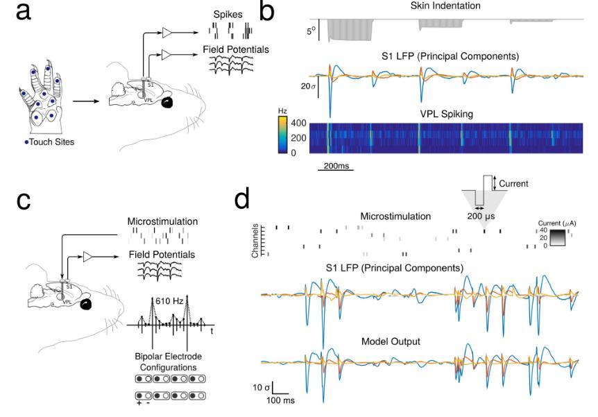 圖2.(a)對前爪腹面不同觸摸部位施加的自然觸覺刺激。(b)通過初級軀體感覺皮層(S1)場電位和丘腦腹后外側(cè)核(VPL)放電率測量的觸摸反應。(c)通過VPL陣列施加的多通道微刺激,同時在S1記錄局部場電位(LFP)。(插圖)微刺激模式參數(shù)化:對于每個通道,脈沖串的幅度由包絡信號調(diào)制。每個刺激通道對應相鄰的電極對。(d)微刺激建模序列示例(上)、對應的S1反應軌跡(中)和線性模型輸出(下)。