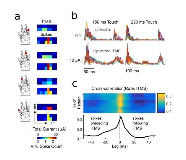 為了量化與VPL放電率的時間相關(guān)性,將背景扣除后的PSTH(見方法)與所有動物的優(yōu)化ITMS進(jìn)行比較。圖7(b)顯示了兩種不同觸摸持續(xù)時間的刺激后放電率和相應(yīng)的優(yōu)化ITMS。對于每個時間點,顯示的波形是通道間的最大電流。最強的刺激脈沖在觸摸開始和結(jié)束后不久傳遞。這類似于VPL放電率的自然時間模式,因為幾乎所有記錄的觸覺響應(yīng)神經(jīng)元都顯示快速適應(yīng)。