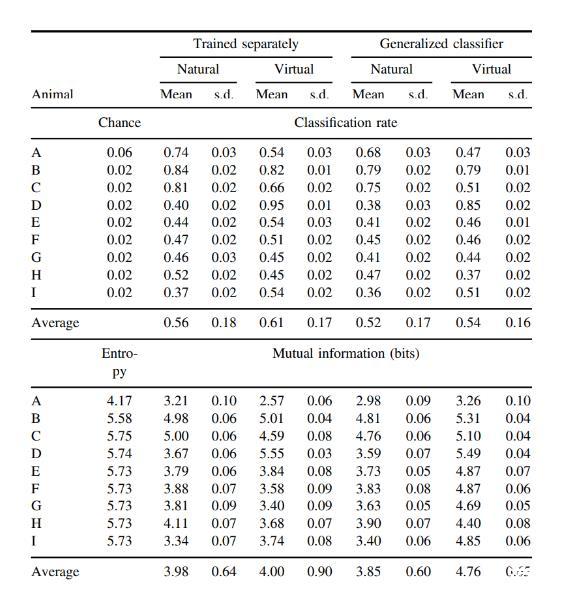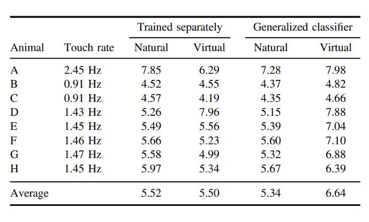使用每只動物的平均觸摸頻率,表3顯示了真實觸摸標(biāo)簽(位置、持續(xù)時間和幅度)與估計觸摸標(biāo)簽之間的信息速率(位/秒)。在各動物中,虛擬觸摸攜帶的信息速率與自然觸摸大致相同。單獨訓(xùn)練的自然和虛擬觸摸的平均信息速率為5.2位/秒,使用廣義分類器的虛擬觸摸的平均信息速率為6.64位/秒。