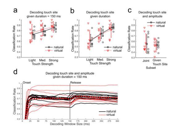 圖8(d)顯示了在固定持續(xù)時間的觸摸下解碼觸摸位置和幅度時,跨一系列窗口大小的分類率。可以看出,對于解碼觸摸部位和幅度,分類率在觸摸開始后15–20 ms達(dá)到峰值,并在整個觸摸窗口中保持較高水平,觸摸結(jié)束后不久略有增加。圖8.從自然(黑色)和虛擬(紅色)觸摸反應(yīng)中正確推斷觸摸參數(shù)的性能。解碼使用廣義分類器——其線性判別分析(LDA)投影使用自然和虛擬觸摸的反應(yīng)進(jìn)行訓(xùn)練。預(yù)測時,新示例首先投影,然后基于最近的自然觸摸均值進(jìn)行分類。分類率計算為(正確分類試驗數(shù))/(總試驗數(shù)),基于8次蒙特卡洛訓(xùn)練/測試數(shù)據(jù)選擇(2/3訓(xùn)練,1/3測試)。數(shù)據(jù)點代表動物。誤差條顯示動物間的±1標(biāo)準(zhǔn)差。(a)僅考慮短(150 ms)持續(xù)時間的輕、中或強刺激試驗時的解碼率。(b)已知觸摸強度時解碼持續(xù)時間和觸摸部位的分類率。(c)第一列顯示所有試驗的分類率,第二列顯示已知觸摸部位時解碼幅度和持續(xù)時間的準(zhǔn)確性。(d)不同窗口大小的分類率。細(xì)線代表動物,粗線顯示動物平均值。