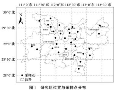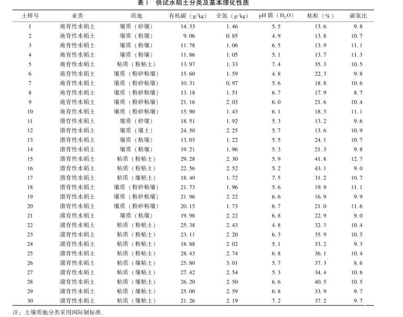2012年晚稻收獲后在環(huán)洞庭湖區(qū)(111°13′~113°31′E,28°12′~29°32′N)采集30個表層(0~20 cm)水稻土樣本(圖1),所有采樣點均長期實行早稻-晚稻-冬閑的耕作制度及類似的田間管理措施。所采土壤代表了洞庭湖區(qū)由河湖沉積物、第四紀紅粘土、花崗巖、石灰?guī)r、紫色砂巖等多種成土母質(zhì)及沖積平原和丘陵坡崗兩種典型地形影響發(fā)育形成的水稻土,包括淹育性、潛育性、潴育性3個水稻土亞類及20余個水稻土土種。各水稻土亞類均采集10個土壤樣本,采集時,在每個采樣點0.1 hm2代表性范圍內(nèi)隨機多點采集5 kg土樣組成混合樣品。采集的混合土樣去除肉眼可見石粒和植物殘渣,經(jīng)風干、過2 mm篩且充分混勻后常溫下貯存待測。土壤采樣點及基本理化性質(zhì)見表1。