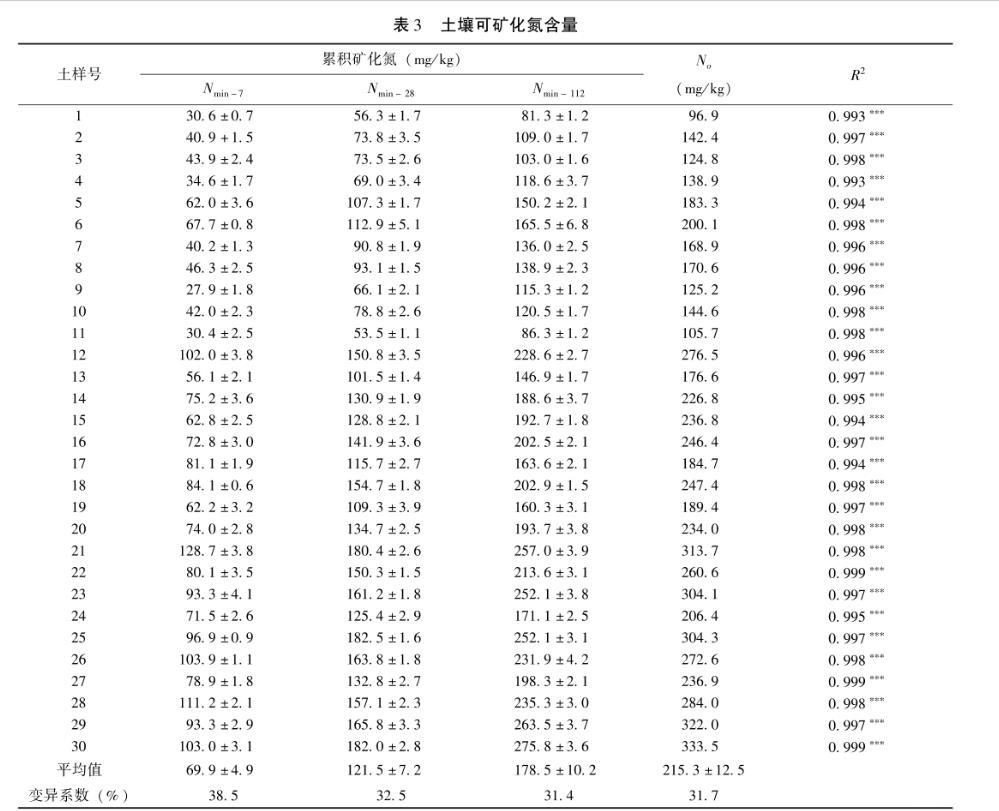 不論水稻土發育類型是否變化,土壤累積礦化氮量均隨培養時間延長而逐漸增加,但有機氮在培養初期礦化相對更為迅速,培養期間各發育類型水稻土包含10個土樣平均的累積礦化氮量始終以潴育性水稻土最高,潛育性水稻土次之,淹育性水稻土最低(圖3)。進一步分析不同培養期(培養7、28和112 d)土壤累積礦化氮量變化顯示,隨培養時間延長,供試土壤間Nmin-7、Nmin-28和Nmin-112值變幅依次增大,但其變異系數卻逐漸降低(表3)。改進的二階指數模型對各供試土壤培養112 d的氮素礦化過程均有很好的擬合效果(R2=0.993~0.999,P<0.001)(表3),同一土壤No擬合值較Nmin-112值提高8.6%~30.6%,No值在不同類型水稻土間總體表現出潴育性水稻土高于潛育性水稻土,更高于淹育性水稻土的變化特征。