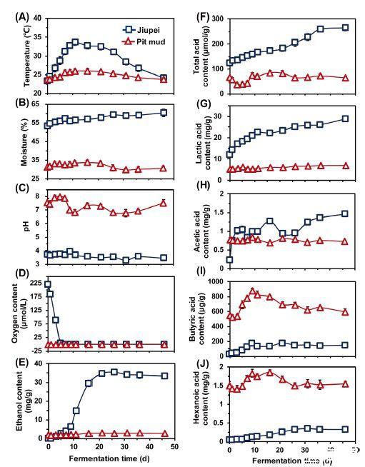 泥窖長期以來一直被用作中式濃香白酒發酵的厭氧生物反應器,其中淀粉原料(主要是高粱)被多物種微生物代謝成乙醇和各種風味化合物。發酵谷物和坑泥是泥窖中兩個空間相關的微生物棲息地,但它們的代謝分工仍不清楚。在這里研究人員研究了發酵過程中發酵谷物和窖泥中環境變量(如溫度、氧氣、pH值)、關鍵代謝物(如乙醇、有機酸)和微生物群落的變化。酒胚(發酵谷物)(低pH值、高乙醇)和窖泥(中性pH值)為微生物生長提供了兩個環境條件截然不同的棲息地。乳酸在發酵谷物中積累,而丁酸和己酸主要由棲息在窖泥中的微生物產生。