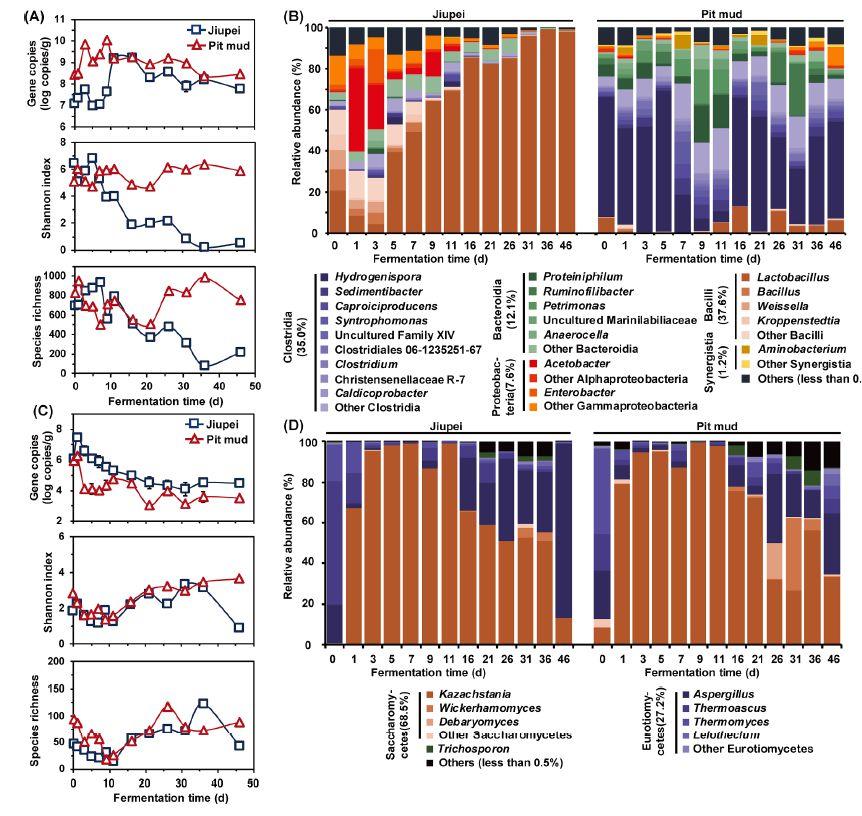 利用實時定量PCR的生物量分析表明,細菌在發酵過程中占微生物群落的主導地位,此外聚類和主坐標分析(PCoA)分析顯示酒胚和窖泥的細菌群落存在顯著差異。Unisense微電極系統被用于監測發酵過程中酒胚和窖泥的氧氣含量變化,研究人員能夠在白酒發酵過程中實時監測氧氣濃度的變化,從而更好地理解發酵過程中微生物的代謝活動和氧氣利用情況。酒胚中細菌群落多樣性在發酵過程中顯著降低,在窖泥中相對穩定。乳酸菌屬在發酵谷物中菌群落中占主導地位,其相對豐度在發酵結束時達到98.0%。梭狀芽胞桿菌(相對豐度:42.9-85.5%)是窖泥中最豐富的細菌,主要分布在氫孢菌屬(5.3-68.4%)。發酵谷物和窖泥的真菌群落表現出相似的演替模式,其中Kazachstania、Aspergillus和Thermoascus是優勢屬。PICRUSt分析表明,參與乙酸和乳酸生物合成的酶主要富集在九平樣品中,而窖泥中的細菌群落表現出更大的丁酸和己酸合成潛力。體外模擬發酵的分析進一步驗證了九平微生物群在乙酸和乳酸生產中的作用,這些酸隨后被坑泥微生物群代謝為丁酸和己酸。本研究工作證明了酒胚(發酵谷物)和坑泥微生物群落之間的協同合作,以形成濃郁風味的白酒的代表性風味。