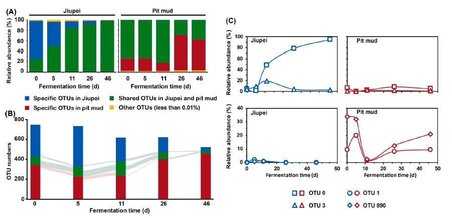 圖4、白酒發酵窖中不同微生物棲息地之間的細菌流動。(A)直方圖顯示了發酵谷物和窖泥樣品在發酵不同階段的共享OTU的相對豐度。(B)跟蹤酒平樣品在不同發酵階段共享OTU的Sankey圖(矩形的高度與OTU的數量相關)。(C)發酵谷物和窖泥中主要OTU的相對豐度動態。
