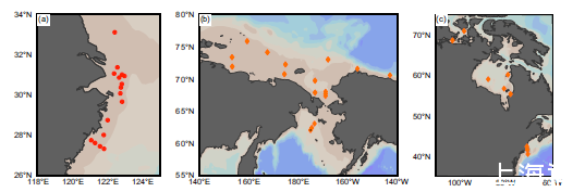 圖4、全球陸架中Re和U的沉積物去除通量位置的分布。a東海。b東西伯利亞海和北美西岸(參考文獻13,46)。c北美東岸。