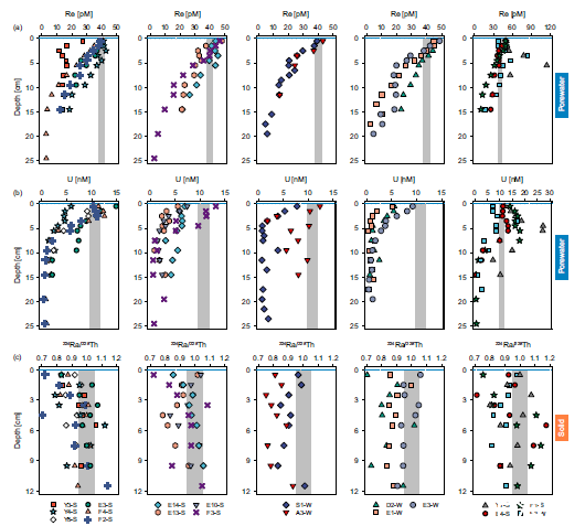 圖1、東海陸架沉積物中孔水Re和U的濃度及散裝224Ra/228Th不平衡。東海陸架沉積物中孔水中Re和U的垂直剖面(a,b)及沉積物中的224Ra/228Th不平衡(c)。樣品分別在2017年夏季的10天內(nèi)、2021年夏季的5天內(nèi)及2018年冬季的5天內(nèi)采集。水平虛線表示沉積物-水界面。224Ra/228Th面板中的豎直條形表示224Ra/228Th比值的總體不確定性,低于左邊界的值表示224Ra從沉積物中釋放。