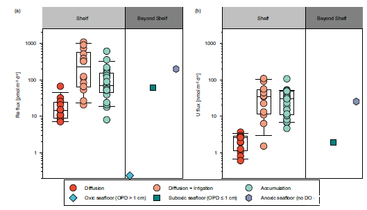 圖5、全球陸架Re和U的面積沉積物還原去除通量匯總。Re(a)和U(b)的面積沉積物去除通量分為兩個組別:陸架(灰色)與陸架外(深灰色)。匯總的通量包括從孔水剖面估算的擴散通量、224Ra/228Th不平衡法推導(dǎo)的總通量(本研究),以及來自參考文獻13–15,28,36,46的陸架沉積物中的自生固體相,以及用于氧化(氧穿透深度(OPD)>1 cm)、亞氧(OPD≤1 cm)和厭氧(無溶解氧(DO))環(huán)境的陸架外代表性沉積率(參考文獻3,20)。箱體上下的誤差條表示第90和第10百分位數(shù)。箱體中的黑色水平線表示第75、第50和第25百分位數(shù)。