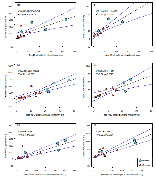 圖3、東海沉積物中Re和U的還原去除與沉積物地球化學(xué)參數(shù)的相關(guān)性。東海沉積物中Re和U的還原去除與沉積物面積放大因子(a,b)、有機碳的厭氧分解速率(通過氨的凈產(chǎn)生確定;c,d)和沉積物氧消耗速率(e,f)的相關(guān)性。三角形和圓圈分別代表夏季和冬季的數(shù)據(jù)。異常的通量在St.E1-W站點的線性回歸中已被排除。