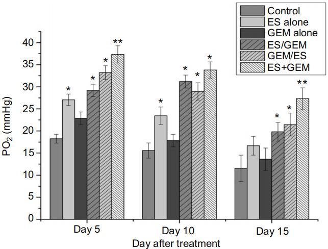 血管生成可誘導腫瘤血管趨于正常,從而改善腫瘤的缺氧狀況。在我們的研究中,使用氧微電極測量了治療第5、10和15天的腫瘤氧合水平(圖3)。如圖3所示,治療第5天(27.06mmHg)和第10天(23.46mmHg),單純ES組的氧合水平明顯高于對照組(18.26mmHg、15.58mmHg,P<0.05),而治療第15天,單純ES組(15.40mmHg)與對照組(11.55mmHg)無明顯差異(P>0.05)。與所有其他組相比,ES+GEM組在治療第5天(37.33mmHg)、第10天(33.81 mmHg)和第15天(27.35mmHg)的PO2最高(P<0.05)。