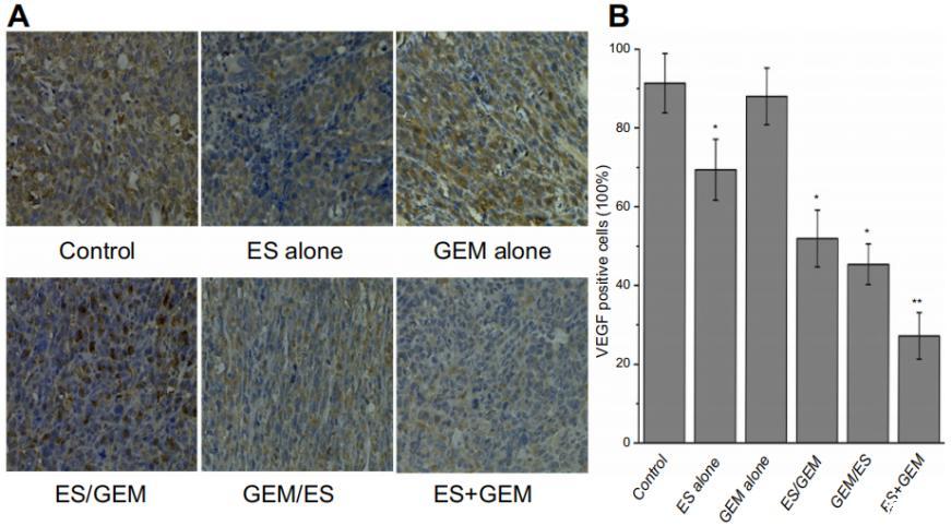為了確定Endostar和吉西他濱治療的影響,通過免疫組化對血管內皮生長因子的表達進行了評估(圖6)。與單純ES組(69.38%,P<0.05)、ES/GEM組(51.93%,P<0.05)、GEM/ES組(45.38%,P<0.05)和ES+GEM組(27.18%,P<0.05)相比,對照組(91.35%)和單純GEM組(87.99%)的VEGF陽性細胞數量較多。在所有組別中,用ES+GEM處理的腫瘤細胞的血管內皮生長因子表達量最低(P<0.05)。