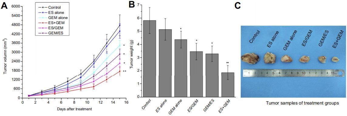 在我們的研究中,我們評估了Endostar聯合吉西他濱對LLC腫瘤生長的抗腫瘤作用(圖2A),并利用小鼠模型確定了它們在體內的最佳給藥順序。當腫瘤體積直徑達到約8-10毫米時開始給藥。治療結束時(圖2A和C),聯合療法(包括GEM/ES(2284.83立方毫米)和ES/GEM(2882.15立方毫米))的腫瘤體積明顯小于單用ES(4386.95立方毫米,P<0.05)或單用GEM(3452.79立方毫米,P<0.05)。與所有其他治療組相比,ES+GEM組的腫瘤體積最小(1758.67mm3)(P<0.05),而與對照組(4767.43mm3,P<0.05)相比,單用GEM組僅適度抑制了腫瘤的生長。與腫瘤體積的變化一致,ES+GEM組的腫瘤重量(圖2B和表1)(1.91克)明顯輕于對照組(5.82克,P<0.05)、ES單藥組(5.14克,P<0.05)、GEM單藥組(4.37克,P<0.05)、ES/GEM組(3.46克,P<0.05)和GEM/ES組(3.12克,P<0.05)。