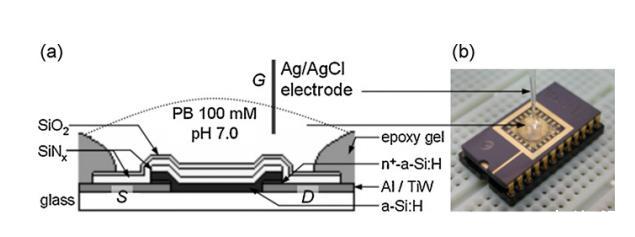 將封裝后的ISFET芯片置于環(huán)氧樹(shù)脂圍堰內(nèi),滴加50-100μL磷酸緩沖液(100mM,pH 7.0),形成微型液滴反應(yīng)池(圖1b)。