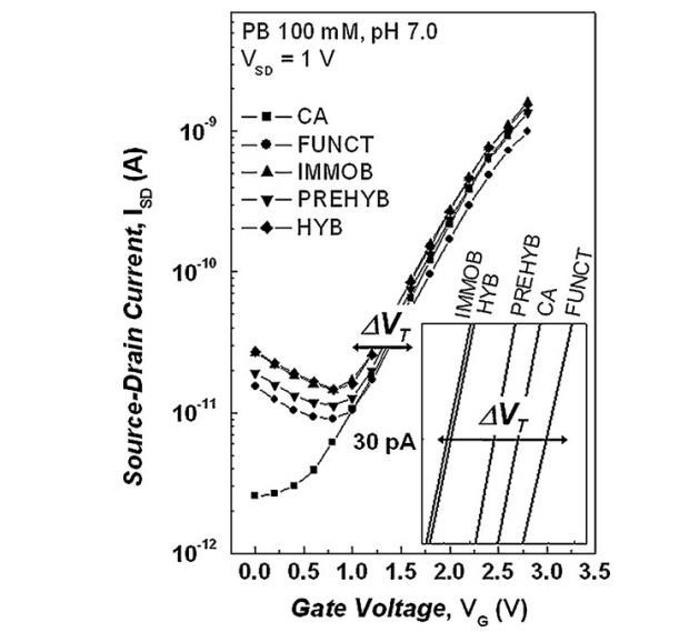 圖2DNA探針固定(IMMOB)與雜交(HYB)引發(fā)的轉(zhuǎn)移曲線(xiàn)右移,閾值電壓偏移量直接反映分子結(jié)合密度