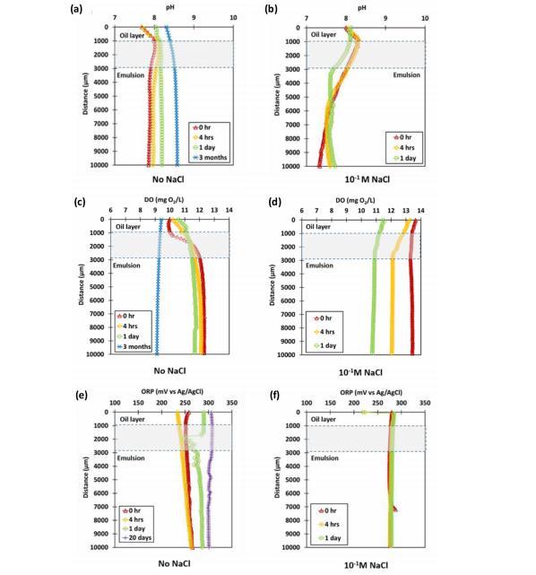 圖5陰離子表面活性劑(SDS)和鹽度對水包油乳液(1%NSBM#4+SDS)中空間與時間維度pH、DO及ORP變化的影響。(a)無NaCl的pH剖面,(b)含0.1 M NaCl的pH剖面,(c)無NaCl的DO剖面,(d)含0.1 M NaCl的DO剖面,(e)無NaCl的ORP剖面,(f)含0.1 M NaCl的ORP剖面。0μm表示傳感器接觸油相時的信號點。油與乳液界面在剖面的灰色區域內隨時間變化。