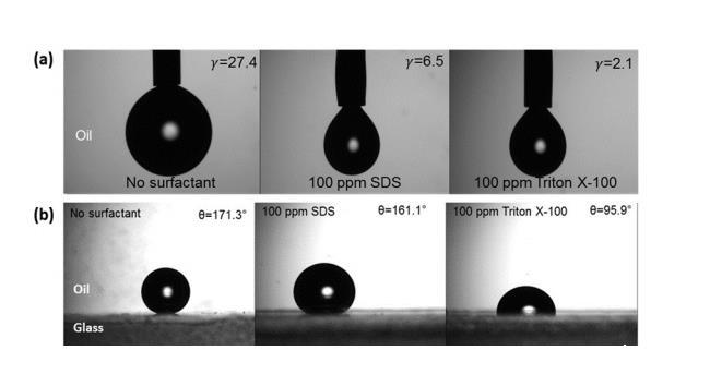 圖S5.(a)油包水懸滴和(b)無表面活性劑、SDS(100 ppm)和Triton X-100(100 ppm)在10??M NaCl的NSBM#4中的接觸角照片。所有測試的周圍介質均為NSBM#4。