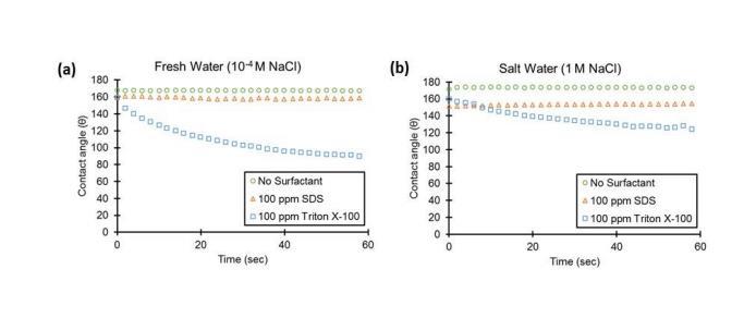 接觸角測量。由于測試中使用的玻璃基板是親水性的,并且表面活性劑基于其親水親油平衡值(HLB)本質上是水溶性的(親水的),因此無法在玻璃(石英)基板上測量表面活性劑水溶液的接觸角。因此,在NSBM#4溶液(周圍介質)中測量了表面活性劑水溶液的接觸角(圖S5)。使用Triton X-100制備的樣品隨時間顯示出動態變化,Triton X-100溶液的接觸角隨時間從160°降至92°(圖S6)。在較高鹽度下,這種下降要慢得多,可能是由于離子強度增加所致。Triton X-100溶液的靜態接觸角在60秒后測量。