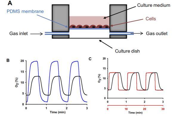 圖1細胞暴露于恒定或可變氧氣濃度的體外實驗系統。A:對培養細胞進行受控間歇性缺氧(IH)的細胞培養設置示意圖(解釋見正文)。B:以60次/小時的頻率進行不同量級的IH(20-1%O2(藍線)和13-4%O2(黑線))時,在膜頂部(細胞培養層)測得的實際氧氣濃度。C:以60次/小時(黑線)和6次/小時(紅線)的頻率施加13-4%O2的IH時,在膜頂部(細胞培養層)測得的實際氧氣濃度。每個時間軸的顏色與相應的線相關聯。B和C中的信號在時間上有所偏移,以便于視覺比較。