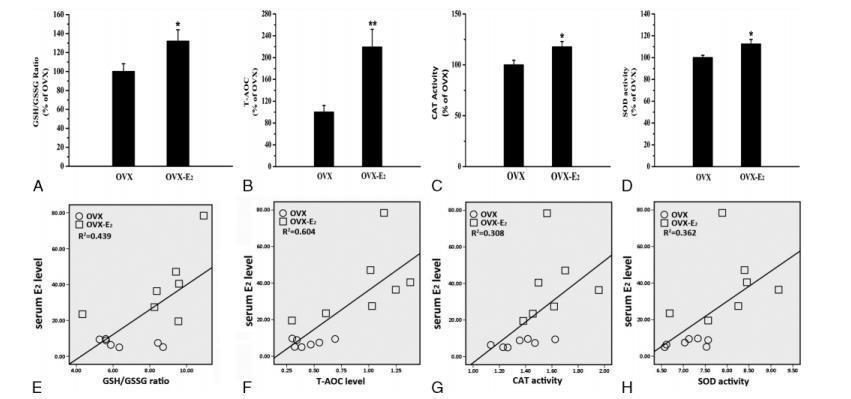 E2療法提高了GSH/GSSG比值以及T-AOC、CAT和SOD的水平(GSH/GSSG比值、CAT活性和SOD活性P<0.05;T-AOC水平與單純OVX相比P<0.01;圖3A-D)。血清E2水平與GSH/GSSG比率以及T-AOC、CAT和SOD水平呈正相關(圖3E-H)。