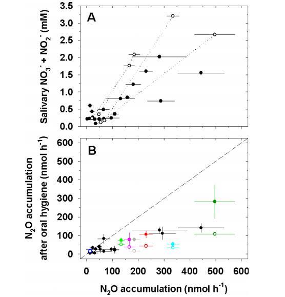 圖4、(a)15名未刷牙志愿者的口腔N2O生成量與唾液中NO2-/NO3-濃度的相關(guān)性。每個數(shù)據(jù)點代表一個人在某一天的口腔N2O累積率(黑點)。有些志愿者不止一天被采樣,因此總共有19個數(shù)據(jù)點。四名志愿者在飲用富含NO3的甜菜根汁前后進行了額外采樣,以增加唾液中NO2-/NO3-的濃度和口腔N2O的積累(虛線連接的白圈)。(b)口腔衛(wèi)生對口腔N2O積累率的影響。刷牙前個人的口腔N2O積累率與刷牙后的N2O積累率對比圖(黑點)。六個人在刷牙后使用了可影響整個口腔細菌的殺菌漱口水(圓圈,六個人各用一種顏色表示)。例如,一個人(深綠色)的口腔一氧化二氮累積率為500nmol/h,刷牙后,其累積率降至290nmol/h。隨后使用漱口水的結(jié)果是110nmol/h。虛線表示口腔衛(wèi)生對口腔N2O積累沒有影響。誤差條表示五次重復(fù)測量口腔N2O積累率的標準誤差。