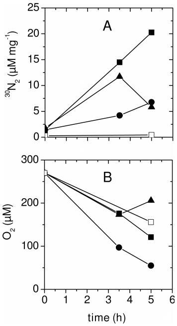 圖1、牙菌斑中的反硝化作用。將三個人的牙菌斑懸浮在含有2%蔗糖和50μM Na15NO3的pH值為7.2的有氧礦物緩沖培養(yǎng)基中。在時間序列實驗中測量了(a)30N2(單位:μM/mg蛋白質(zhì))和(b)表觀O2濃度(單位:μM)的形成。每個符號類型代表一個人牙菌斑培養(yǎng)的30N2和O2測量值。對照組是在沒有Na15NO3的情況下進行的。