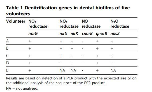 表1、五名志愿者牙齒生物膜中的反硝化基因。