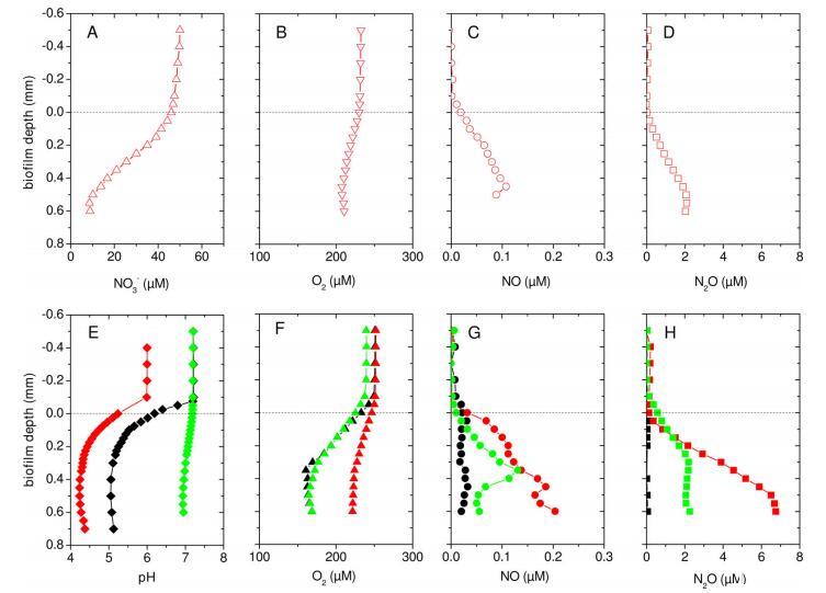從反硝化代謝平衡的角度來看,酸性條件導(dǎo)致的NO絕對增加量很小。這一點很明顯,因為在酸性條件下,N2O(NO的還原產(chǎn)物)的深度平均增加量比NO濃度的增加量高出約兩個數(shù)量級。這表明生物膜細菌能有效地將大部分NO轉(zhuǎn)化為N2O,從而將細胞毒性NO的穩(wěn)態(tài)濃度保持在較低水平,這在環(huán)境生物膜中也有觀察到。