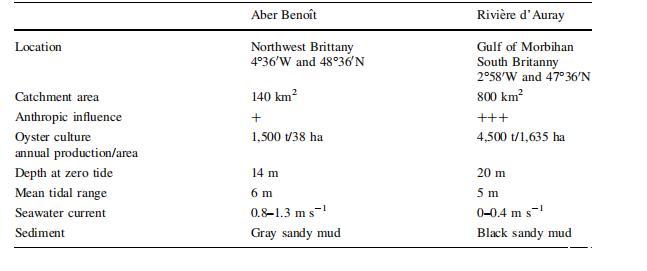 奧雷河河口區域(圖1B2;表1)長56.4公里,代表南布列塔尼莫爾比昂灣(Gulf of Morbihan)的西部。它受到人類活動的影響,主要是流域面積800平方公里內的農業活動,圍繞兩條主要河流:洛赫河(Loch)和薩爾河(Sal)。這些河流匯入奧雷河,洛赫河平均流量為2.99 m3s?1,薩爾河流量約為其一半。潮汐流導致海灣50%的水體每10天(20次潮汐)更新一次,并產生高達0.4 m s?1的流速。在奧雷河下游用于牡蠣養殖的區域(1,635公頃),鹽度變化范圍為27至35(PSS78)。零潮位水深為20米。自該現象開始以來,牡蠣死亡幾乎每年都發生,特別是因為夏季溫度超過19°C。