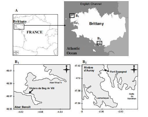 采樣在法國兩個牡蠣養殖高度發達的河口進行(圖1A,B):(1)阿伯貝努瓦河下游(4°36'W和48°36'N)和(2)奧雷河口附近的一個牡蠣養殖場(Fort Espagnol)(2°58'W和47°36'N)。