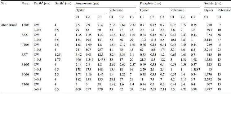 表3用于計算阿伯貝努瓦河和奧雷河磷酸鹽、銨和硫化物擴散通量的上覆水(OW)和孔隙水中銨、磷酸鹽和硫化物濃度