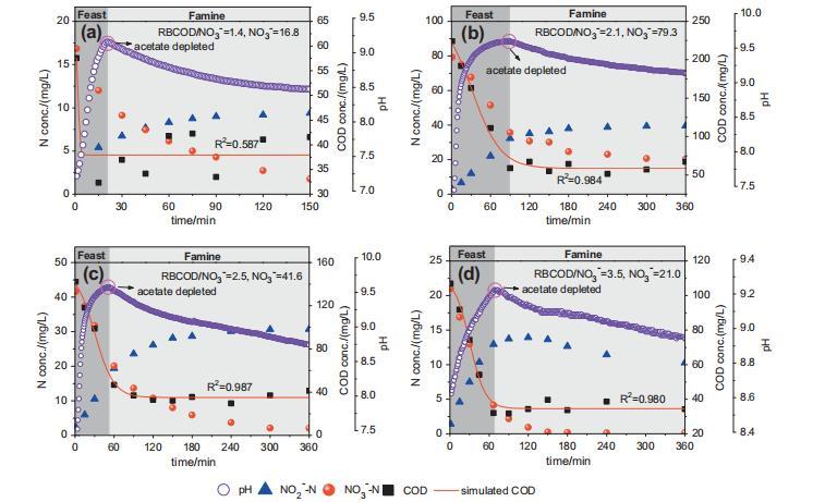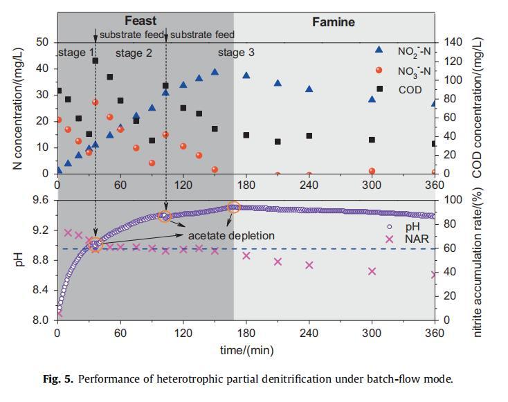 (3)RBCOD/NO3-=2.7的批次流模式中,通過(guò)pH精準(zhǔn)指示"充足-匱乏"狀態(tài),可實(shí)現(xiàn)60%的高NAR;