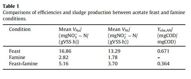如表1所示,外源反硝化的VNa和VNi分別是內(nèi)源反硝化的6倍和7.5倍,證實(shí)外源代謝更有利于硝酸鹽還原酶活性。Yobs,AN由外源期的0.671 mgCOD/mgCOD降至內(nèi)源期的0.364 mgCOD/mgCOD,表明內(nèi)源代謝可顯著減少剩余污泥產(chǎn)量。