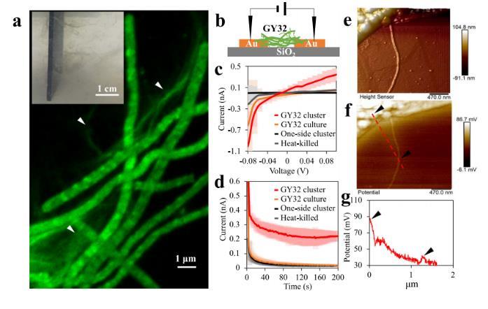 圖5、Geobacter、纜狀細菌和L.varians GY32的導電網(wǎng)絡(luò)比較。Geobacter可以形成由短單細胞細菌和外源導電蛋白納米線組成的導電網(wǎng)絡(luò)(即生物膜)。絲狀多細胞纜狀細菌通過細菌外膜中的細胞間納米線導電。L.varians GY32結(jié)合了絲狀形態(tài)與外源納米線狀附屬物,形成導電網(wǎng)絡(luò)。