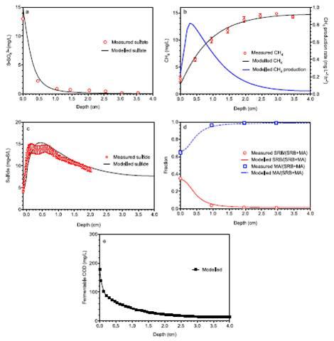 圖4、硫酸鹽(a)、甲烷(b)、硫化物(c)、SRB和MA的相對組分(d)的實驗和模擬深度剖面;可發酵COD在沉積物中滲透剖面(e)的模擬結果。沉積物表面深度為0 cm。