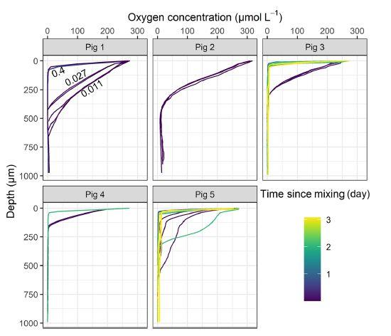 圖4、在室溫下孵育長達(dá)3天的不同豬糞中的氧含量分布。