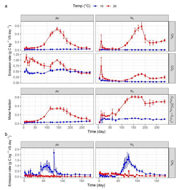 圖3、(a)豬糞貯藏實驗中CH4和CO2及其摩爾分?jǐn)?shù)的排放率,以每瓶貯藏實驗開始時的揮發(fā)性固體(VS)質(zhì)量歸一化。將糞便在10°C(紅色)或20°C(藍(lán)色)下與空氣或N作為頂空交換氣體一起孵育。(b)貯藏實驗后厭氧消化階段的CH排放率。在厭氧消化過程中,所有處理均在38°C下與頂空N一起孵育,顏色是指在儲存實驗期間之前孵育的溫度(紅色=20°C,藍(lán)色=10°C)。數(shù)據(jù)以平均值±標(biāo)準(zhǔn)差(n=4)表示。