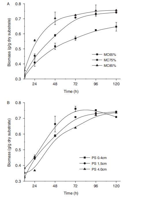 在生物量轉化過程中,固態底物的水分含量(MC)和顆粒長度(PL)是影響生物量轉化效率和微生物生長的主要參數,特別是對于固態發酵。^17,18結果表明,對于所有實驗,從12小時到72小時的發酵時間內,真菌生物量迅速增加,然后在72小時到120小時的發酵時間內保持恒定值(圖1)。最大的生物量約為每克底物0.75克,在85%MC和0.4 cm PL條件下,發酵時間從12到120小時獲得(圖1)。圖1顯示,SSF中的真菌生物量在水含量實驗中遵循85%>75%>65%的順序,在顆粒長度實驗中遵循0.4 cm>1.5 cm>4.0 cm的順序。結果表明,高水分含量和小顆粒長度有利于真菌生物量的增加,可能是因為它增強了營養物質傳遞和利用效率。^19
