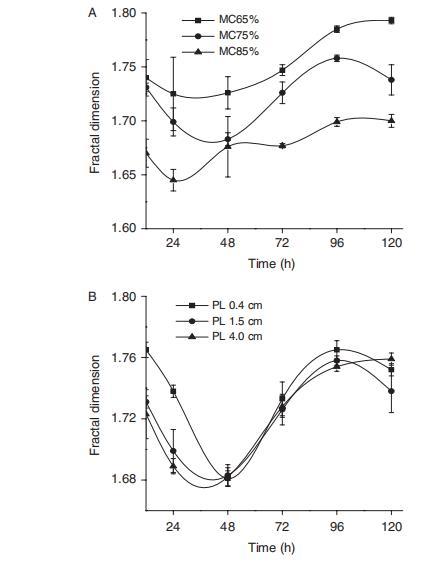 底物形態結構因發酵過程的利用和降解作用而被真菌生長明顯改變。^20,21在使用Penicillium decumbens JUA10的SSF過程中,真菌菌絲體與底物交織在一起,形成難以分離的混合物。在先前的研究中,分形維數已被有效地用于評估真菌-底物復合物。圖2顯示,SSF中的分形維數在水含量實驗中遵循65%>75%>85%的順序,在顆粒長度實驗中遵循0.4 cm>1.5 cm>4.0 cm的順序。結果表明,高水分含量和大顆粒長度提供了最低的分形維數。同時,有趣的是,分形維數在發酵時間從12小時到48小時期間下降,然后在發酵時間從48小時到120小時期間增加。造成這種情況的可能原因是,在真菌生長的早期階段,由于真菌占據底物內部空間,分形維數降低。然而,隨著發酵時間的增加,真菌利用導致固態底物分解成小塊,這導致底物的分形維數逐漸增加。同樣有趣的是,發酵48小時后不同顆粒長度的分形維數差異小于發酵48小時前的差異(圖2(B))。造成這種情況的可能原因是,大顆粒長度生物質在48小時后被降解成小塊。同時,小顆粒長度生物質在發酵過程中容易團聚,然后在固態發酵后期顆粒長度生物質的差異減小,這導致相應的分形維數差異也減小。因此,結果表明,分形維數可以有效地表達底物形態結構的變化,并且也可以在固態發酵中不同水分含量和顆粒長度下表征真菌生物量的相應增長。