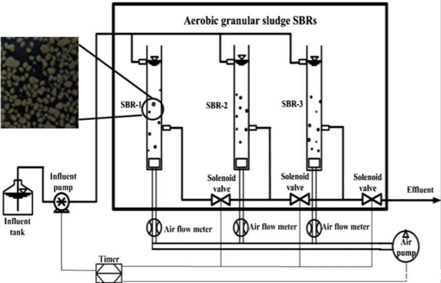 建立了三個相同的實驗室規模序批式反應器(SBRs)(圖1)。反應器由透明有機玻璃制成,每個有效體積為1.5 L,內徑5 cm,深度100 cm。空氣通過安裝在反應器底部的曝氣器,使用水族箱氣泵供應,到三個SBR反應器(命名為SBR1、SBR2和SBR3)的空氣流速分別通過流量計控制在0.2、0.6和1.0 L空氣/分鐘(相應的比空氣流速分別為0.17、0.51和0.85 cm/s)。環境溫度為14±4°C。使用蠕動泵(Longer,中國)將等量的進水廢水泵入三個反應器,處理后的廢水通過電磁閥排出。