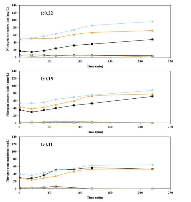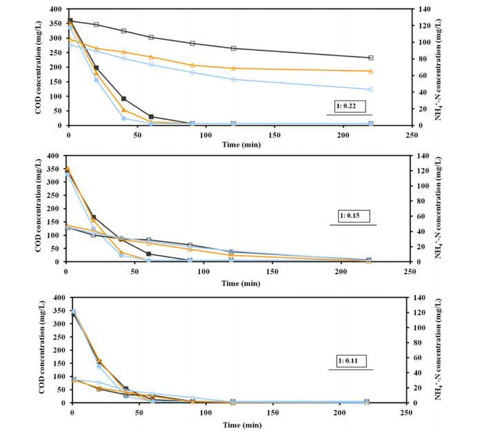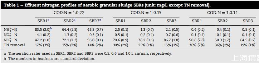 在三個(gè)SBRs(分別以0.2、0.6和1.0 L空氣/分鐘的曝氣速率運(yùn)行)在三個(gè)COD:N比值(1:0.22,1:0.15和1:0.11)下,平均COD去除效率均超過(guò)99%。三個(gè)SBRs在三個(gè)COD:N比值下運(yùn)行的出水NH 4+?N,NO 2??N和NO 3??N濃度如表1所示。