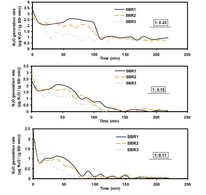 然而,在曝氣速率為1.0 L空氣/分鐘的SBR3中,DO濃度在曝氣開(kāi)始后急劇上升,并在10-20分鐘后在液相中達(dá)到飽和(圖2)。N2O濃度在曝氣開(kāi)始后下降。平均比N2O產(chǎn)生速率下降并在COD:N比為1:0.22和1:0.15時(shí)穩(wěn)定在約1.1μg N?O/(g SS·分鐘)。當(dāng)COD:N比為1:0.11時(shí),由于進(jìn)水氮濃度較低,平均比N?O產(chǎn)生速率持續(xù)下降至0.2μg N?O/(g SS·分鐘)(圖3)。高曝氣速率導(dǎo)致體相流體中DO水平較高,這可能誘導(dǎo)氧氣更深地?cái)U(kuò)散到顆粒中并抑制反硝化作用。SBR3中比SBR1和SBR2更低的TN去除率表明了這種抑制。因此,SBR3中的N?O產(chǎn)生量低于SBR1和SBR2。