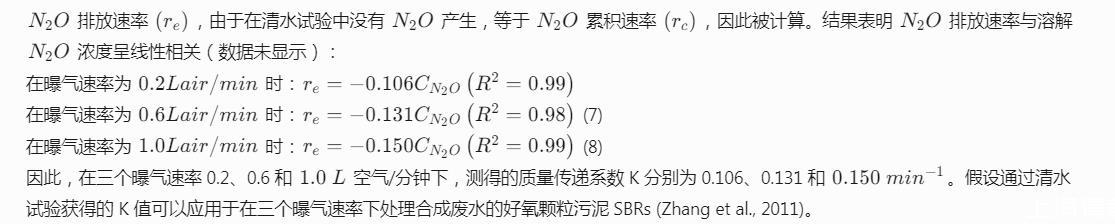 N2O排放速率left(r e),由于在清水試驗(yàn)中沒(méi)有N2O產(chǎn)生,等于N2O累積速率left(r c),因此被計(jì)算。結(jié)果表明N2O排放速率與溶解N2O濃度呈線(xiàn)性相關(guān)。