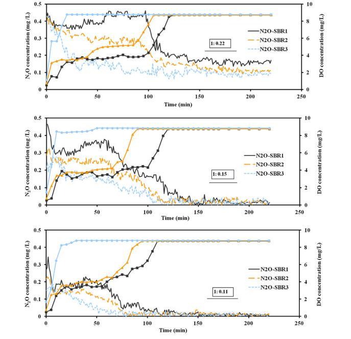 在SBR1、SBR2和SBR3中,當(dāng)處理COD:N比為1:0.22的廢水時(shí),出水溶解N?O濃度分別為0.17 mg/L、0.11 mg/L和0.09 mg/L,分別相當(dāng)于出水中總氮的0.13%、0.08%和0.06%。當(dāng)處理其他兩種COD:N比值的合成廢水時(shí),出水N?O濃度均低于0.01 mg/L。