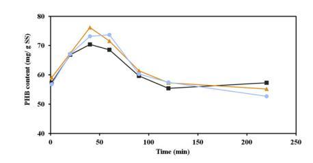 在圖5中,一旦廢水被泵入反應(yīng)器,就出現(xiàn)了PHB積累。當(dāng)大部分COD被利用后,顆粒中的PHB含量在SBR1、SBR2和SBR3中分別升至70.4、76.2和73.2 mg/g SS;之后逐漸下降,表明污泥消耗了PHB。直到PHB含量降至最低水平之前,比N2O產(chǎn)生速率在SBR1、SBR2和SBR3中分別保持在1.8、1.7和1.2μg N?O/(g SS·分鐘)。這證實(shí)了PHB可以在大部分COD耗盡后用于異養(yǎng)反硝化。