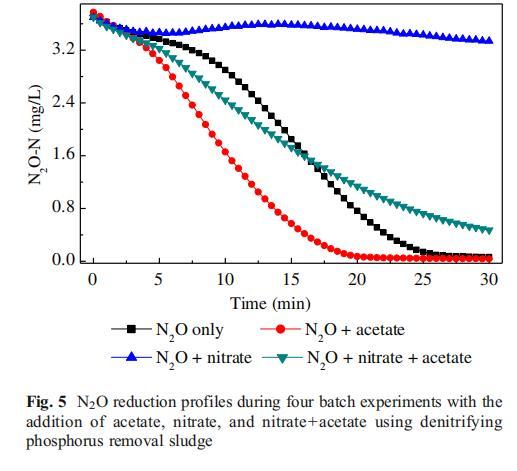 因此,連續投加硝酸鹽或使用丙酸鹽為碳源均可減少反硝化除磷過程的N?O生成。此外,減少厭氧時間、使用污泥堿性發酵液及添加銅離子(Cu2?)等措施也有報道可降低生物脫氮除磷過程的N?O生成(Wang et al.2011b;Zhu and Chen 2011;Zhu et al.2012),其在反硝化除磷工藝中的適用性值得深入研究。