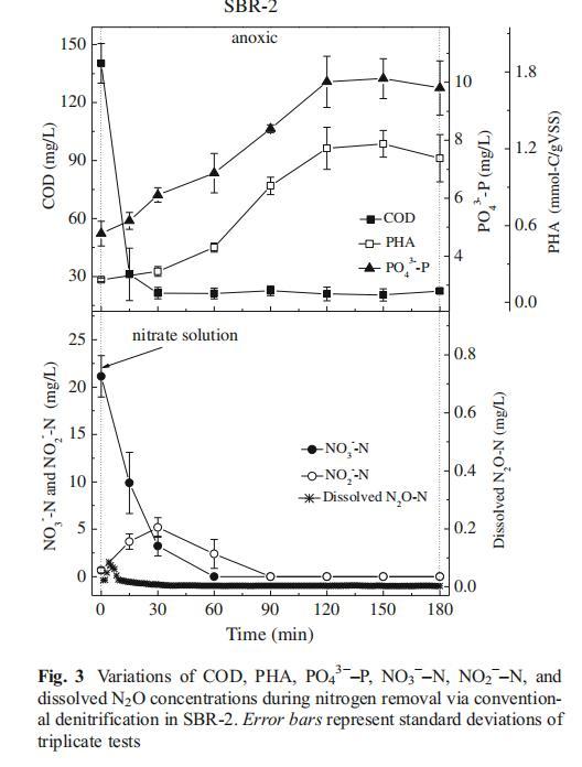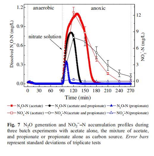 SBR-1中,N?O主要在缺氧階段生成,厭氧階段幾乎未檢測到;KNO?溶液投加后,溶解態N?O-N濃度在前15分鐘迅速升至0.87 mg/L,隨后急劇降至接近零(圖2)。類似地,SBR-2缺氧初期也觀察到N?O瞬時積累(圖3),但其最高溶解態N?O濃度僅0.08 mg/L,遠低于SBR-1。此外,尾氣N?O也被測定,氣相和液相總N?O生成量見表1。可見SBR-1的N?O生成量(占TN去除量的0.41±0.034%)雖顯著高于SBR-2(0.013±0.0056%),但遠低于先前反硝化除磷系統的報道值(2.34–21.6%)(Wang et al.2011a,b)。這可能歸因于使用了丙酸鹽與乙酸鹽的混合碳源,而非單一乙酸鹽。相較于乙酸鹽,丙酸鹽作為碳源顯著降低了廢水處理過程的N?O生成(Zhu and Chen 2011)。