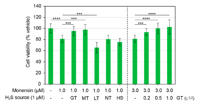 圖5、高爾基體TCM和MitoTCM可防止高爾基體應激誘導的細胞死亡。用莫能菌素(1或3μM)和DMSO(0.5%)、高爾基中藥(GT,0.2,0.5或1μM)、有絲分裂中藥(MT,1μM)、溶出中藥(LT,1μM)、非靶向中炔烴(NT,1μM)或NaSH(HS,1μM)處理H9C2細胞。使用CCK-8試劑盒評估細胞活力。結果表示為SD±平均值(n=12)。