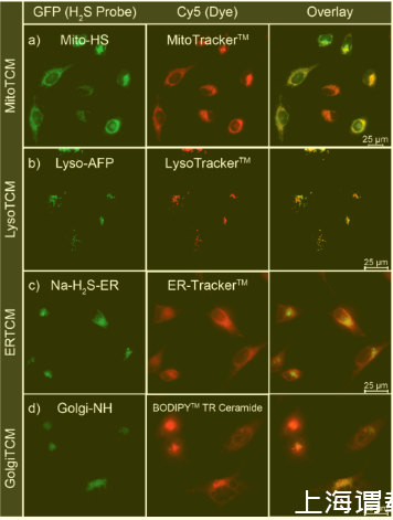 圖3、HeLa細胞中局部HS產生的活細胞成像。(a)在Mito-HS(10μM)和MitoTracker(50 nM)存在下,MitoTCM(200 nM)的線粒體定位硫化氫遞送。(b)在Lyso-AFP(10μM)和LysoTracker(50 nM)存在下,LysoTCM(200 nM)的溶酶體定位硫化氫遞送。(c)在NaHS-ER(10μM)和ER-Tracker(1μM)存在下,從ERTCM(200 nM)獲得ER定位的硫化氫遞送。(d)在高爾基體-NH(5μM)和BODIPY TR神經酰胺(2μg/mL)存在下,高爾基中藥(200 nM)的高爾基體定位硫化氫遞送。