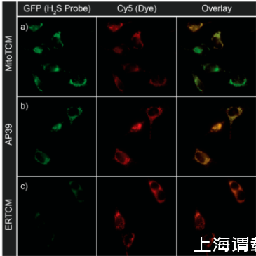 圖4、在存在Mito-HS(10微摩爾)和MitoTracker(50納摩爾)的情況下,對200納摩爾的(a)MitoTCM、(b)AP39和(c)ERTCM進行活細胞成像。