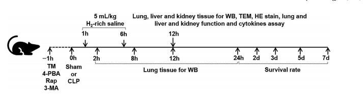 實驗4:小鼠隨機分為五組:Con組、CLP組、CLP+H2組、CLP+H2+3-MA組和CLP+H2+TM組。在假手術和CLP手術后1小時和6小時腹腔注射富含H2-的生理鹽水(5mL/kg)。TM和3-MA處理同實驗2和3。術后12h檢測血清中的肺MPO活性、BLA總蛋白、肺W/D、ALT、AST、Cr和BUN。采集部分肺組織,用Western印跡法檢測NF-κb,用ELISA法檢測細胞因子TNF-α、IL1β、IL-6和HMGB1的表達。部分肺、肝和腎組織經H&E染色進行器官損傷評分。分析小鼠術前、術后1d、2d、3d、5d和7d的存活率。